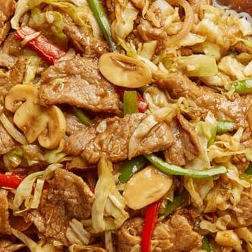 1 PORÇÃO GRANDE DE CARNE BOVINA COM REPOLHO, PIMENTÕESCEBOLA E COGUMELOS.