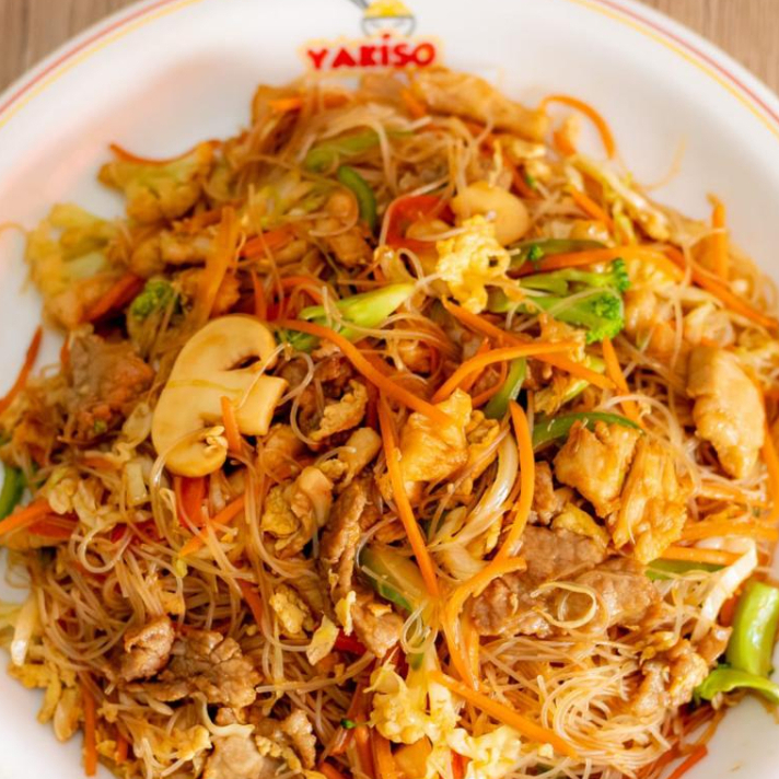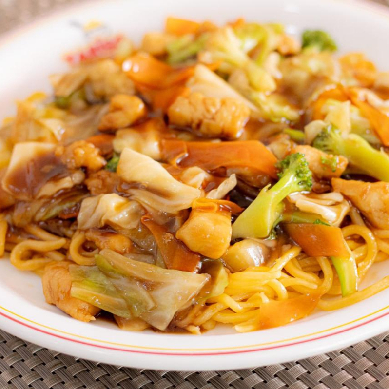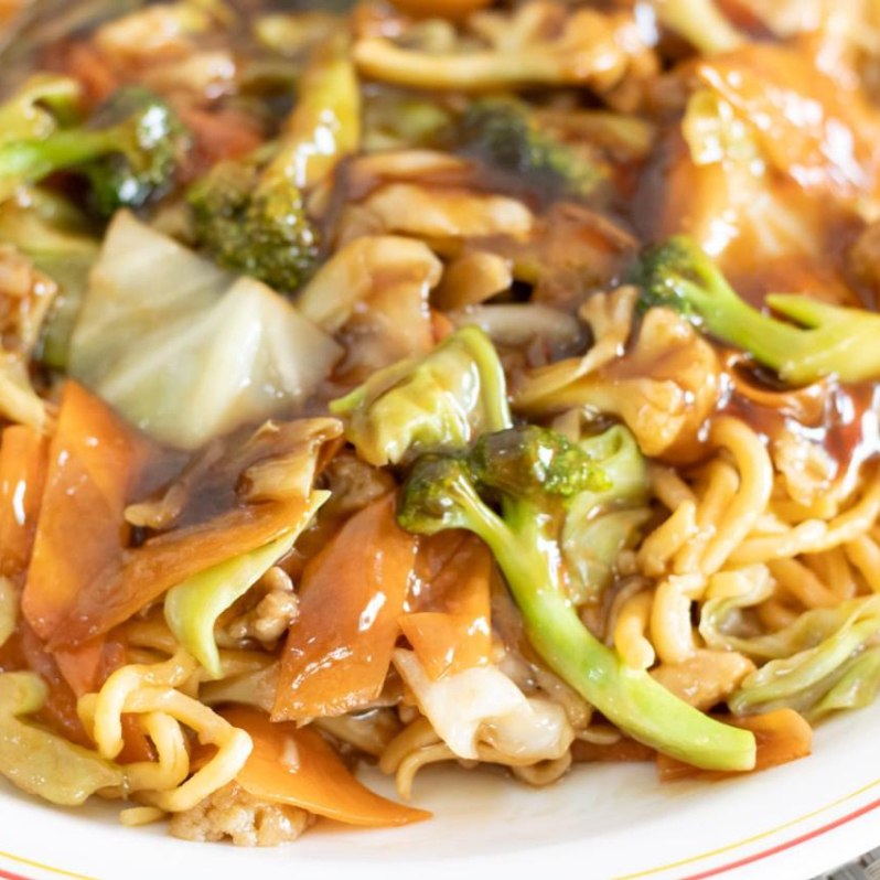 SERVE 1 PESSOA MACARRÃO FRITO COM CARNE BOVINA FRANGO, REPOLHO, BRÓCOLIS, COUVECENOURA E COGUMELOS.