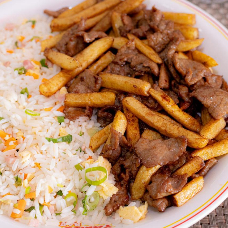 1/2 PORÇÃO PEQUENA DE CARNE BOVINA AO MOLHO SHOYU COMBATATAS FRITAS + 1/2 PORÇÃO PEQUENA DE ARROZ CHOP SUEY