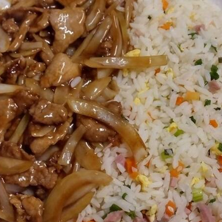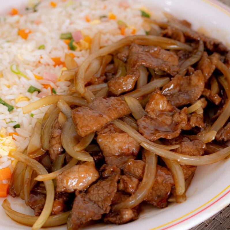 1/2 PORÇÃO GRANDE DE CARNE BOVINA COM TIRAS DE CEBOLA + 1/2PORÇÃO GRANDE DE ARROZ CHOP SUEY.