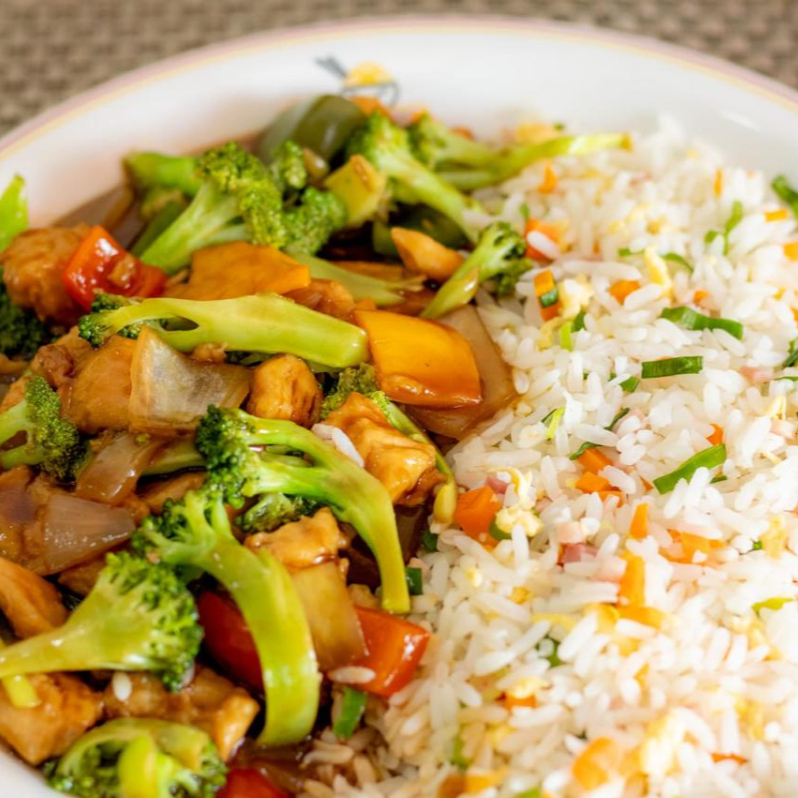 1/2 PORÇÃO GRANDE DE FRANGO COM BRÓCOLIS, PIMENTÕES E COGUMELOS + 1/2 PORÇÃO GRANDE DE ARROZ CHOP SUEY.