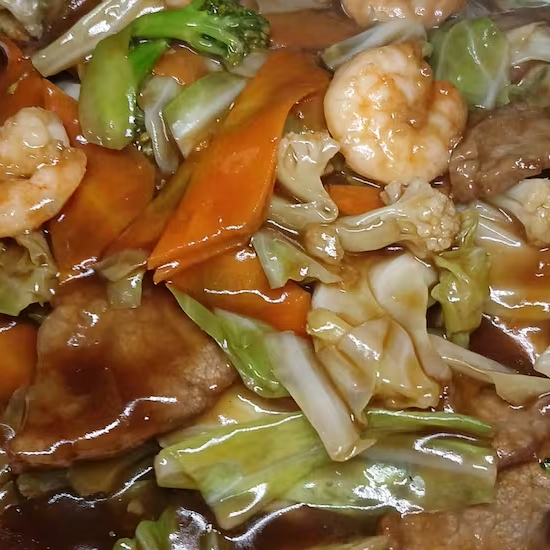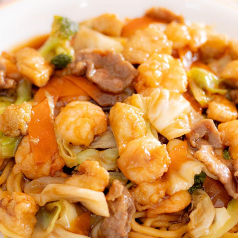 SERVE 1 PESSOA,MACARRÃO FRITO COM FRANGO, CAMARÃO, CARNE, REPOLHO, BRÓCOLIS, COUVE-FLOR, CENOURA E COGUMELOS.
