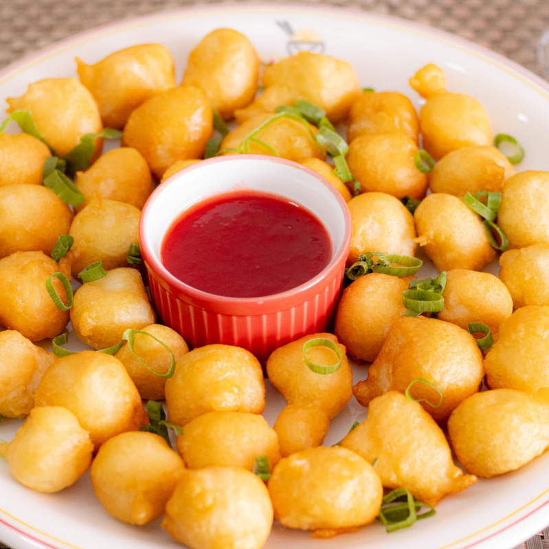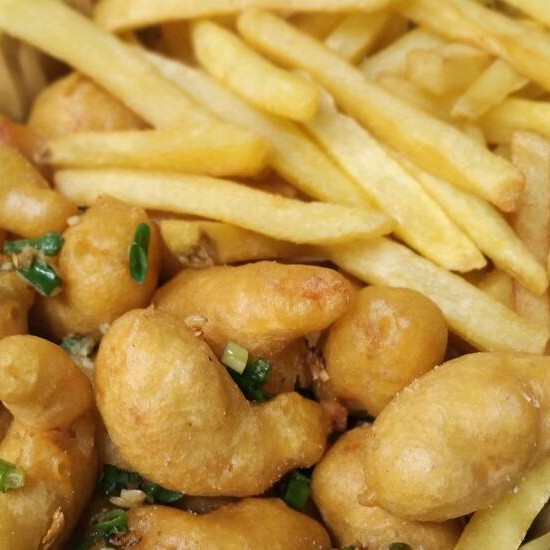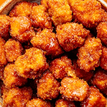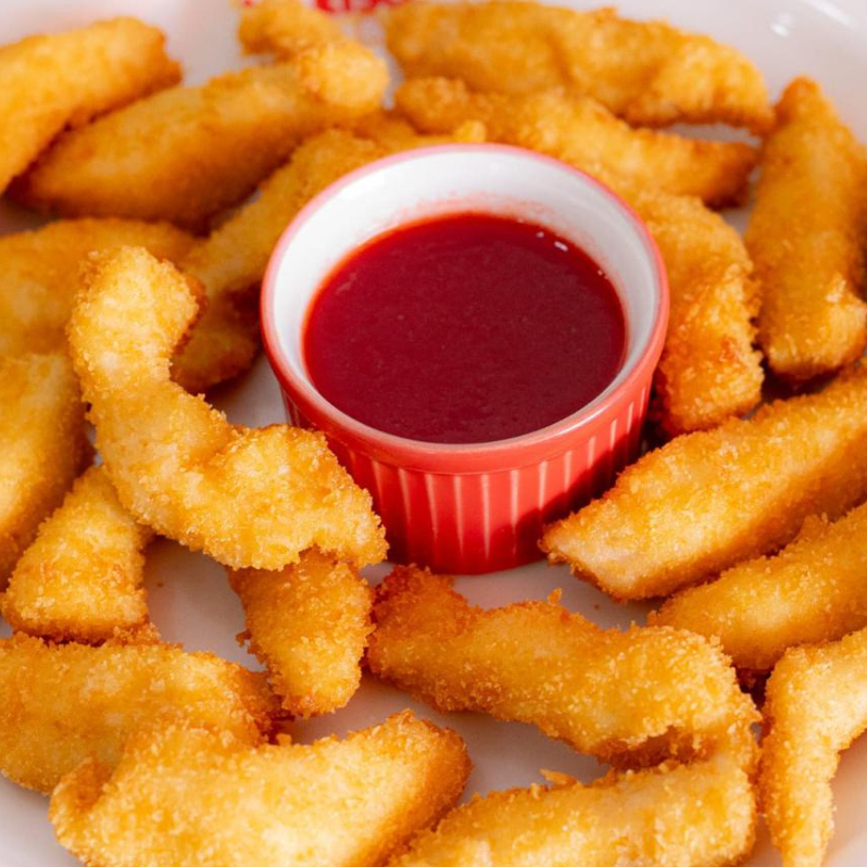 FRANGO EMPANADO ENVOLVIDO EM MASSA LEVE E ACOMPANHA MOLHO AGRIDOCE.