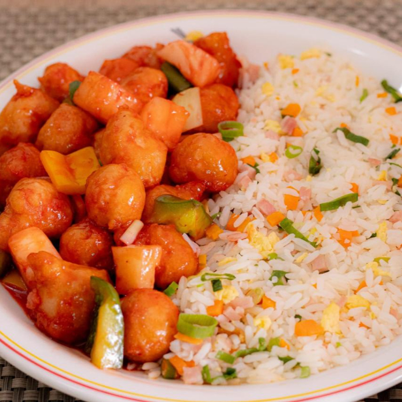 1/2 PORÇÃO PEQUENA DE LOMBO EMPANADO AO MOLHO AGRIDOCECOM CEBOLA, PIMENTÃO E ABACAXI + 1/2 PORÇÃO PEQUENA DE ARROZ CHOP SUEY.