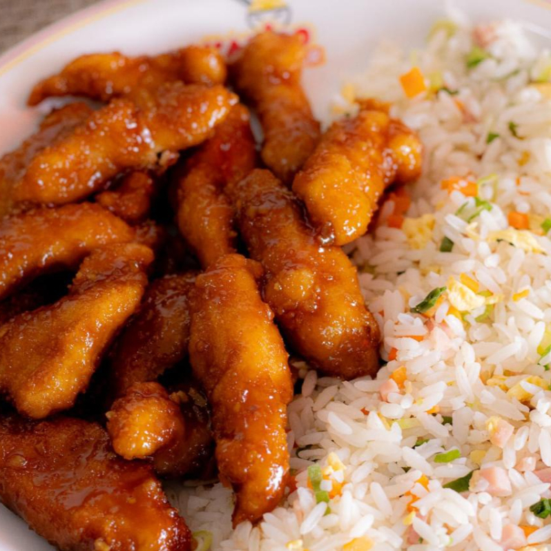 1/2 PORÇÃO PEQUENA DE FRANGO CRISPY ENVOLVIDO AO MOLHO DLARANJA + 1/2 PORÇÃO PEQUENA DE ARROZ CHOP SUEY.