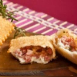 LOMBO EMPANADO ENVOLVIDO EM MASSA LEVE E FACOMPANHA MOLHO AGRIDOCE.