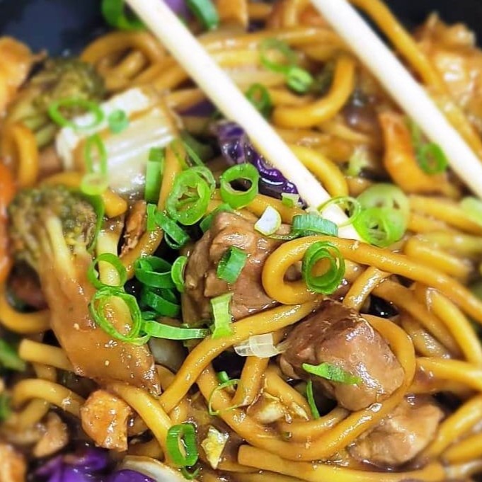 frango , macarrão , legumes refogado em um delicioso molho ( legumes : brócolis, vagem, cenoura, couve-flor,repolho verde , repolho roxo, acelga e cebolinha)