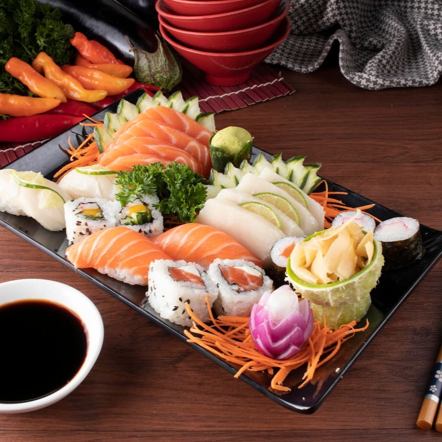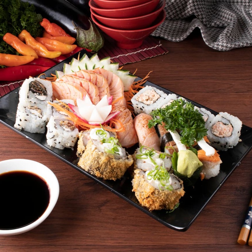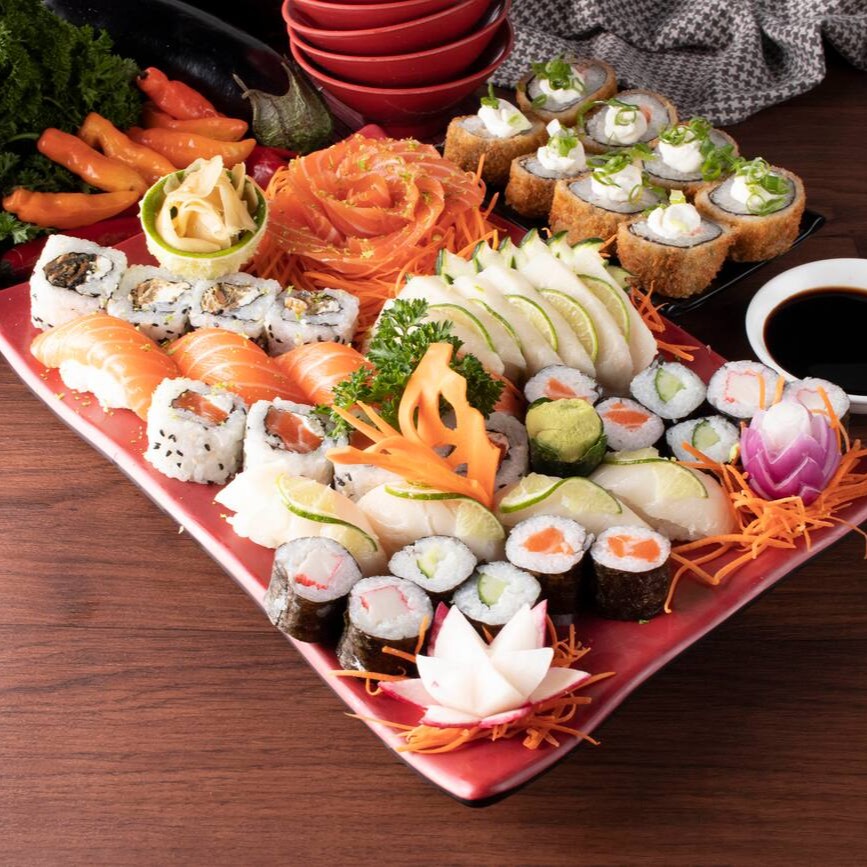 6 sashimi de salmao, 6 sashimi de peixe salmão flambado, 4 uramaki skin, 4 uramaki salmão Grelhado , 4 hossomaki pepino, 4 hossomaki kani, 4 hossomaki salmão, 4 niguiri de salmão, 4 niguiri Skim.