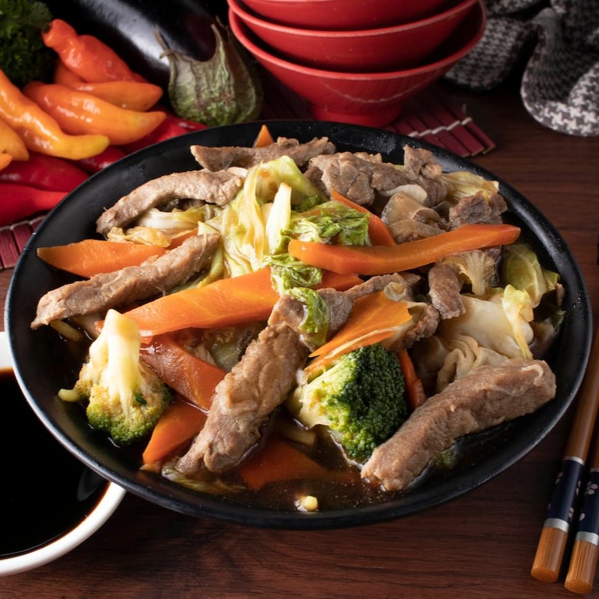 Macarrão yakissoba de carne com legumes (Acelga, brócolis, cenoura, repolho, cebolinha e gergelim), temperado ao molho de soja especial.