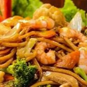 Macarrão yakissoba de camarão, carne, frango e legumes (Acelga, brócolis, cenoura, repolho, cebolinha e gergelim), temperado ao molho de soja especial.