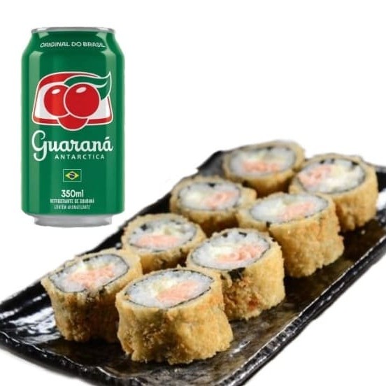 Sushi Empanado com Salmao Grelhado, Shari, Cream Cheese, Cebolinha Finalizado com cebolinha - 8 Unidades + Guaraná lata
