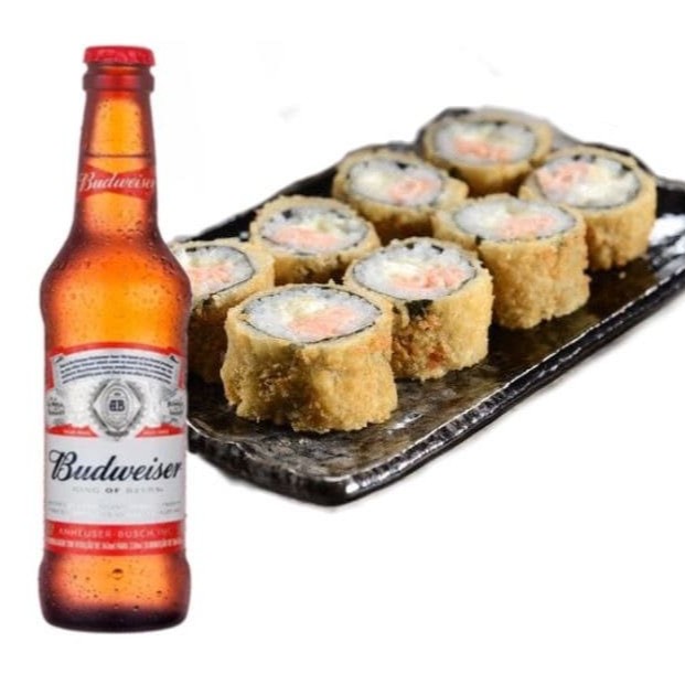 Sushi Empanado com Salmao Grelhado, Shari, Cream Cheese, Cebolinha Finalizado com cebolinha - 10 Unidades + Budweiser 330ml.