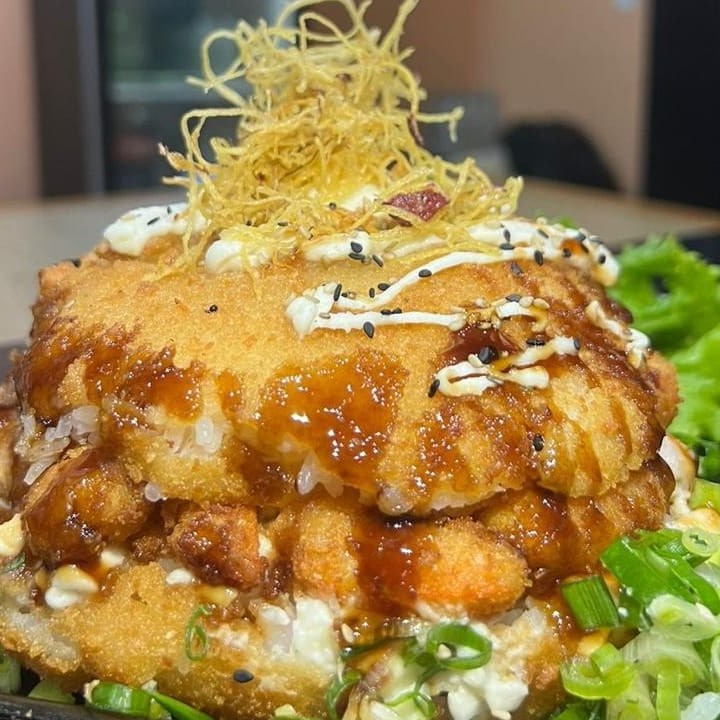 Manga, sunomonu, salmão grelhado, shimeji, cebola roxa, creme chesse, batata crispy, shari, tomate cereja, gergilim, couve crispy