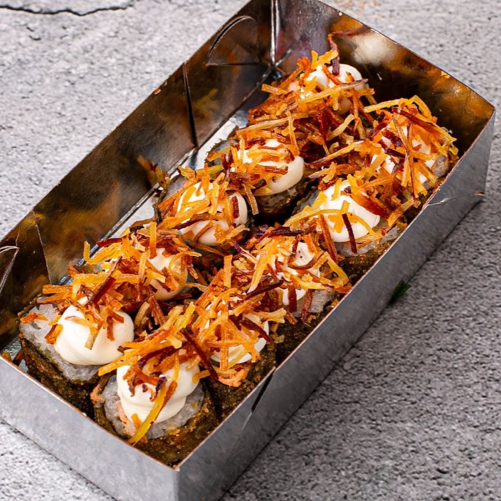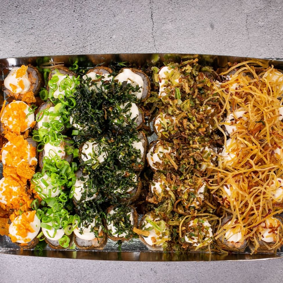 10 hot roll com couve crispy, 5 niguiri de salmão, 5 uramaki filadélfia com batata crispy