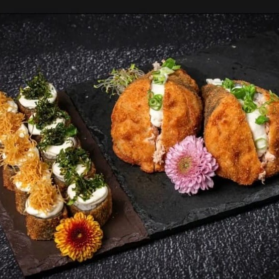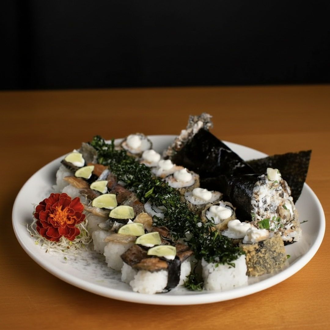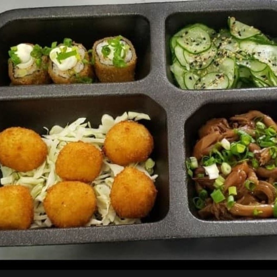 Manga, sunomonu, atum, shimeji, cebola roxa, creme chesse, batata crispy, shari, tomate cereja, gergilim, couve crispy