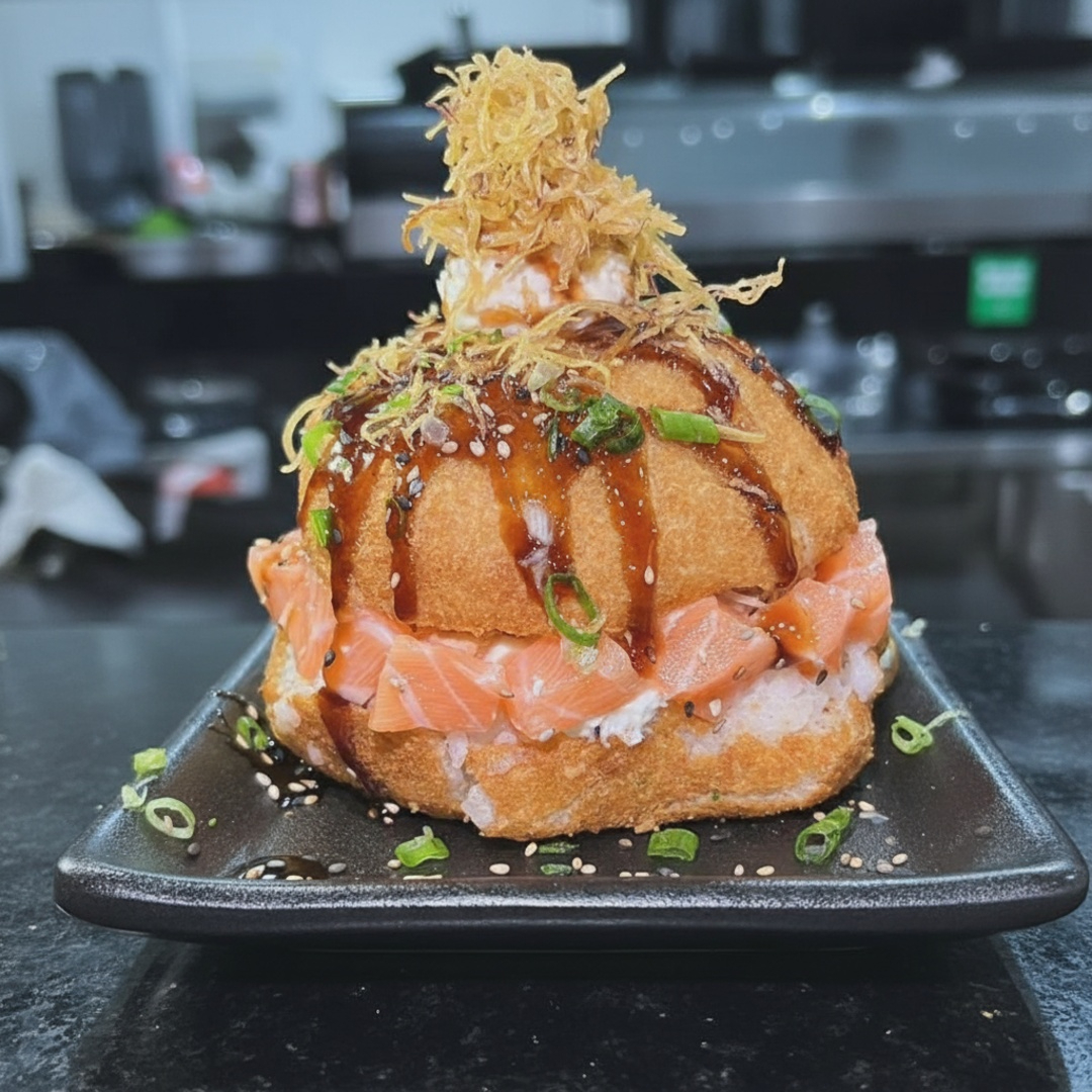 Manga, sunomonu, salmão, shimeji, cebola roxa, creme chesse, batata crispy, shari, tomate cereja, gergilim, couve crispy