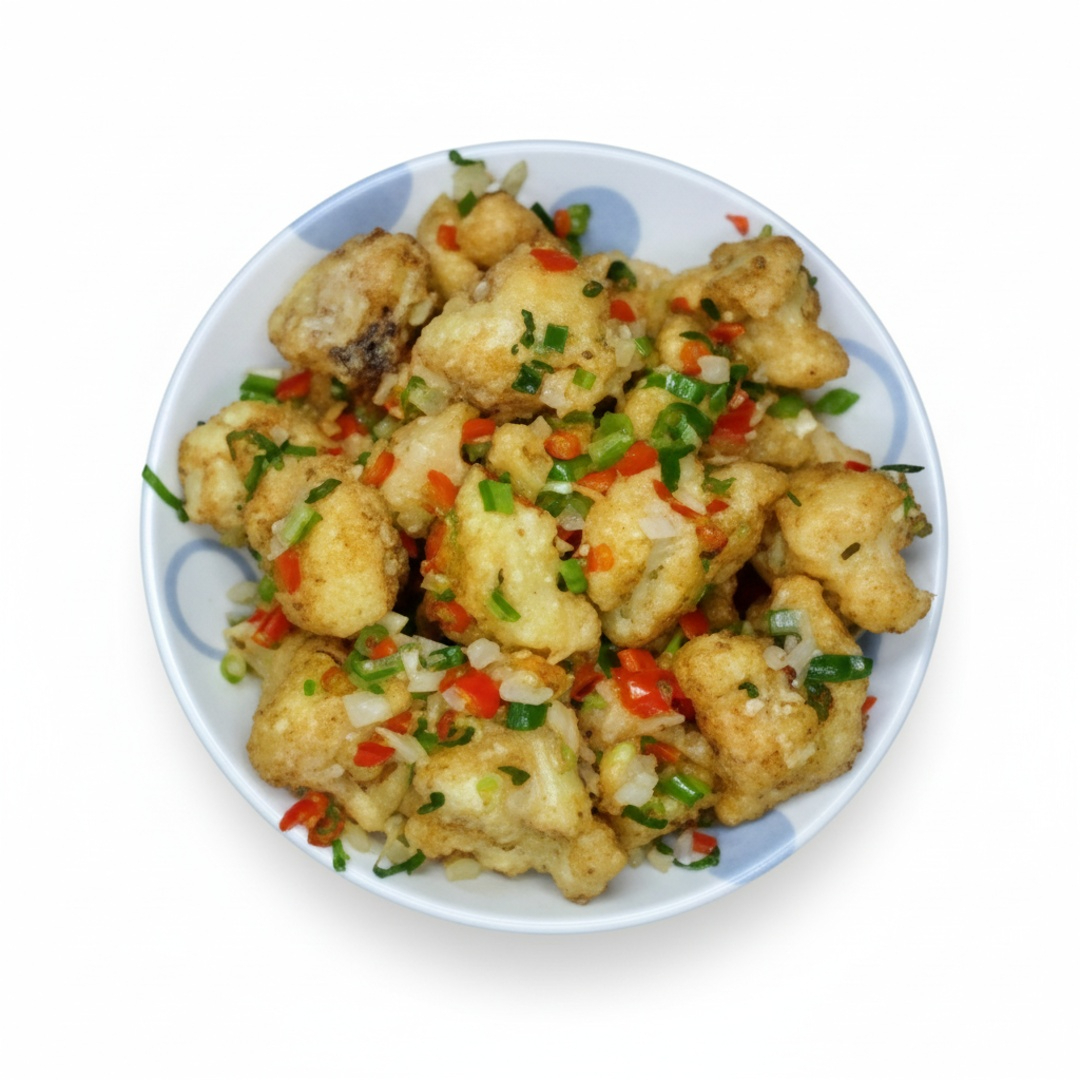 O maravilhoso e evidente famoso Camarão frito vem com aquela textura inigualável e sabor único com casca temperado e frito decorado com pimentões verde e vermelho.