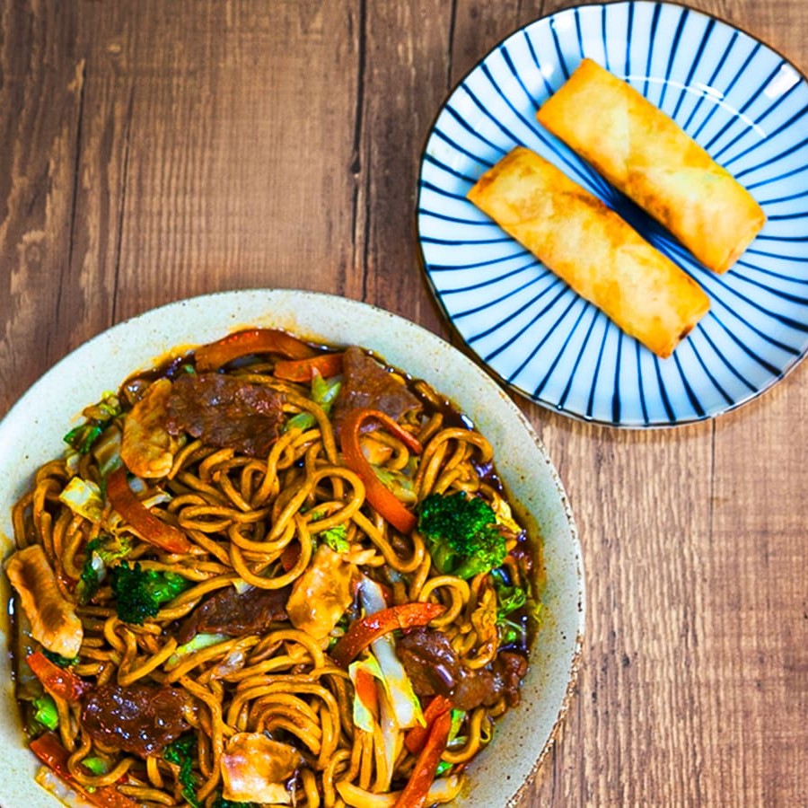 Combo com Desconto: macarrão perfeito, carne e frango suculentos e legumes frescos salteados no wok, tudo regado com nosso molho especial da casa, um blend exclusivo com muito umami. Acompanha 2 crocantes rolinhos primavera (apenas legumes), perfeitos para complementar essa experiência oriental. Peça agora e aproveite o melhor yakisoba da região! #Yakisoba #comidaoriental #comidaasiatica #comidachinesa #yakissoba