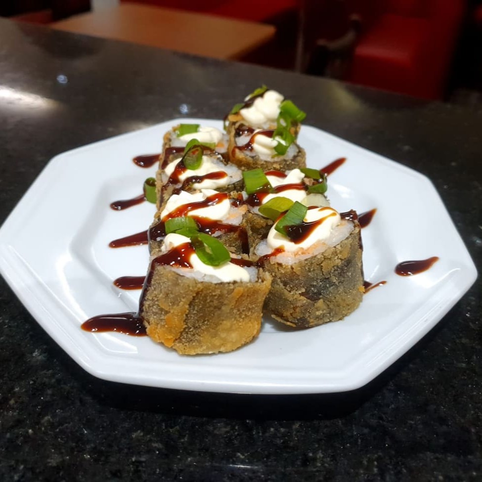 Sushi frito recheado com salmão grelhado e cream cheese.