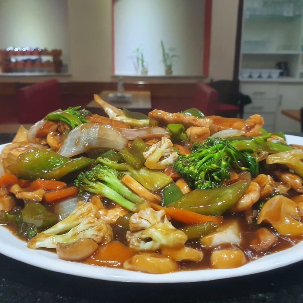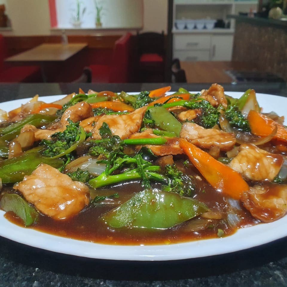 Fatias de carne suina,cubos de frango com camarão,champignon,couve-flor,cebola,pimentão,vagem e cenoura ao molho de shoyu.