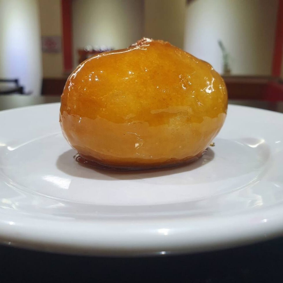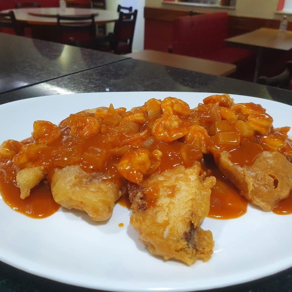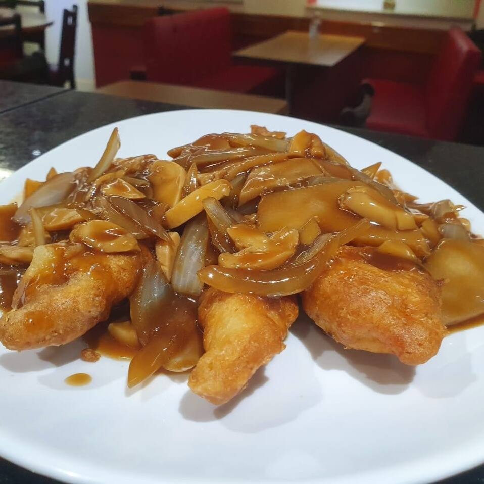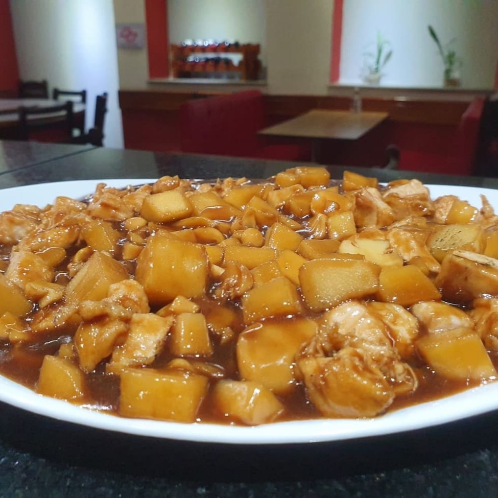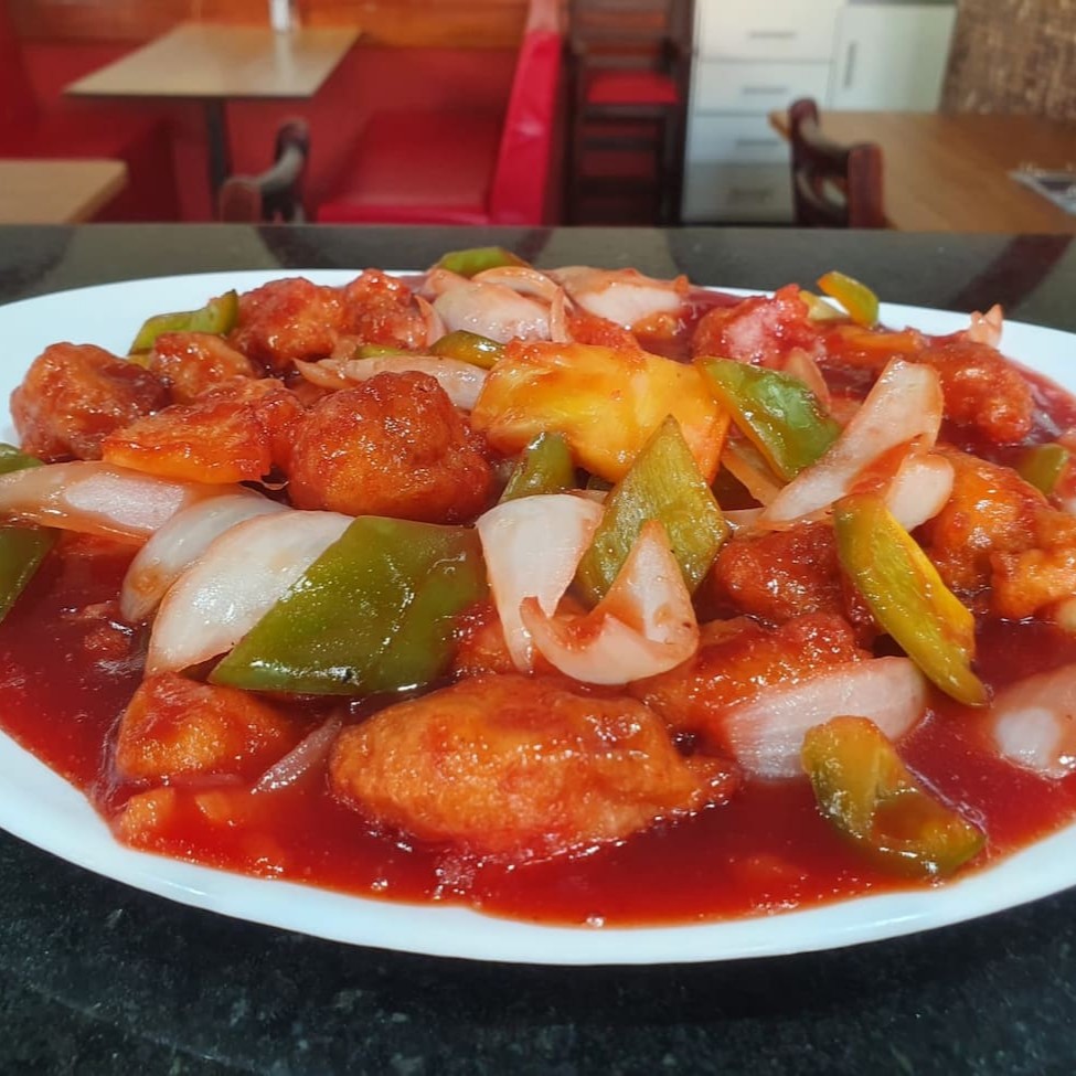 Lombo em cubos empanados com pimentão, cebola, abacaxi ao molho agridoce.