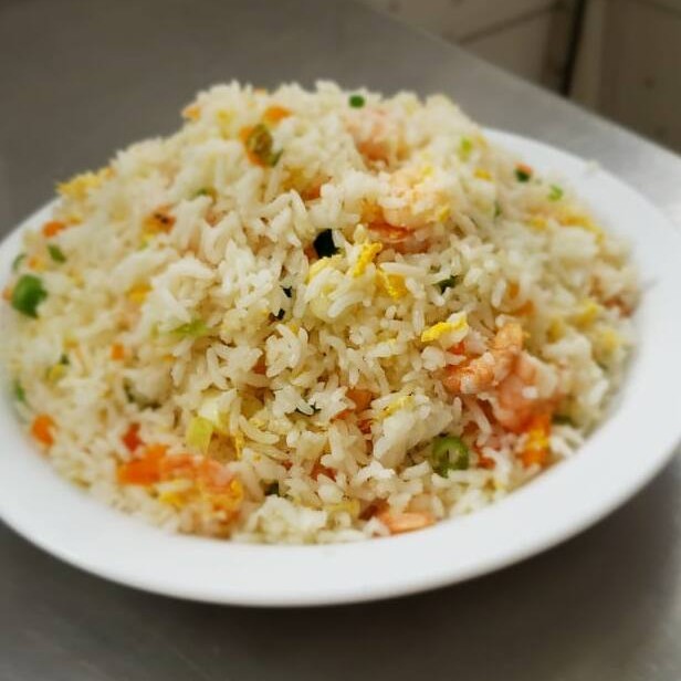 Arroz com camarão,ovo,cenoura,vagem e cebolinha.