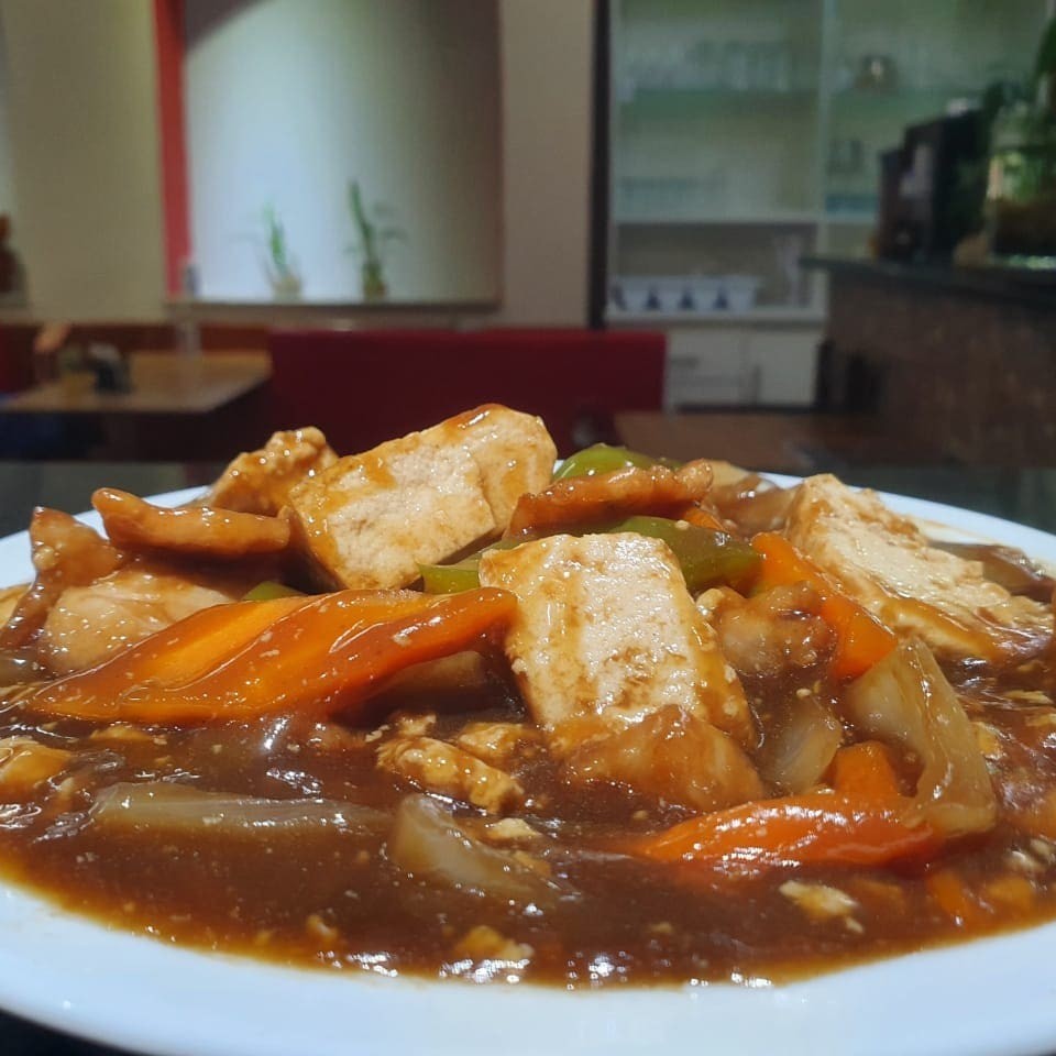Pedaços de tofú ao molho de carne ,cebola,pimentão,vagem,cenoura e molho shoyu.