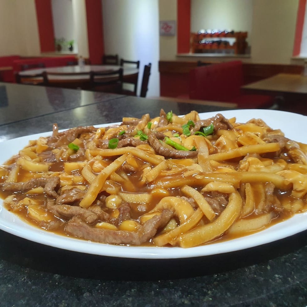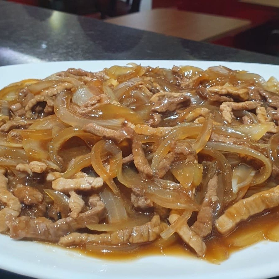 Carne de vaca em tiras refogada na cebola com shoyu.