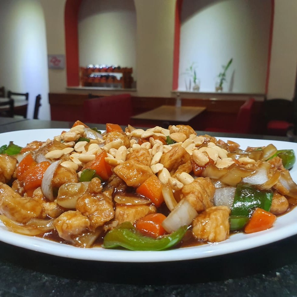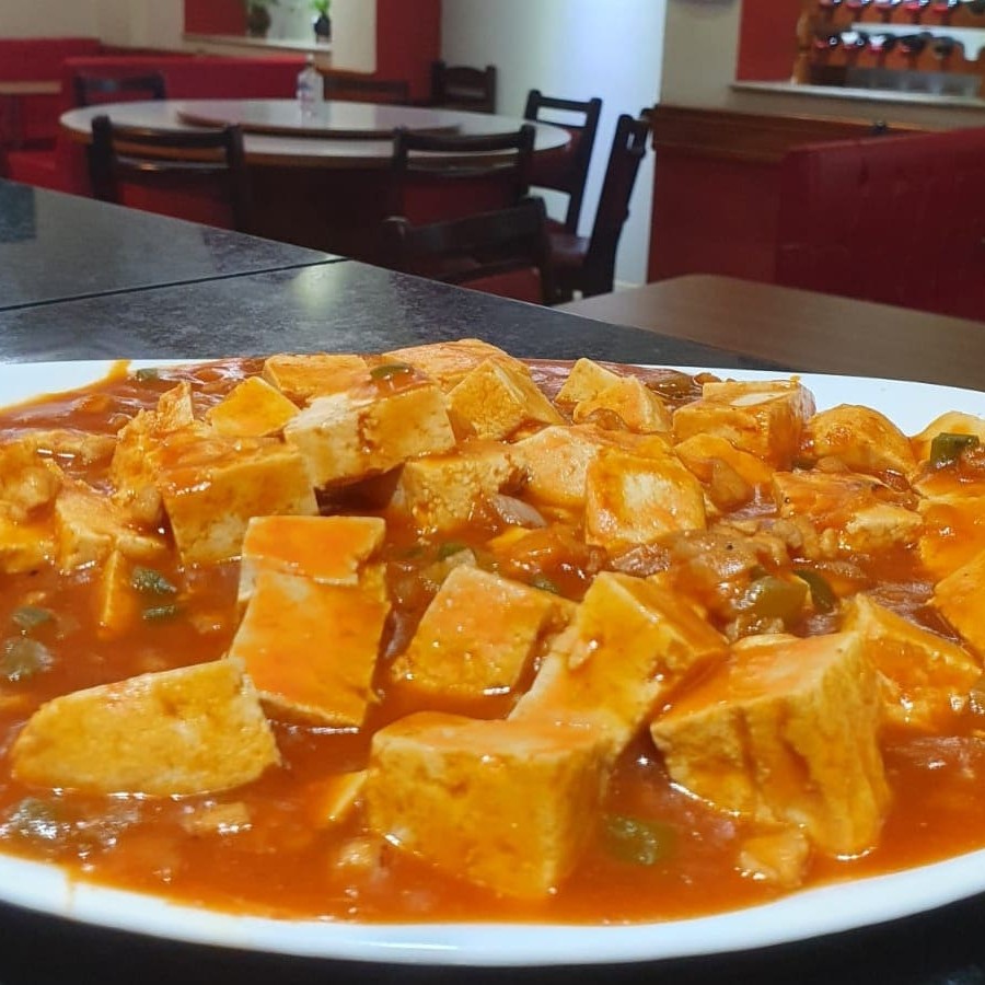 Tofú em cubos ao molho de tomate com carne suína, cebola e pimentão picados com pimenta.