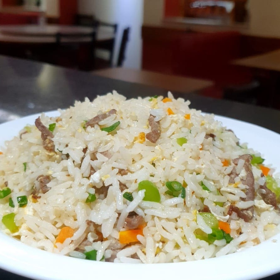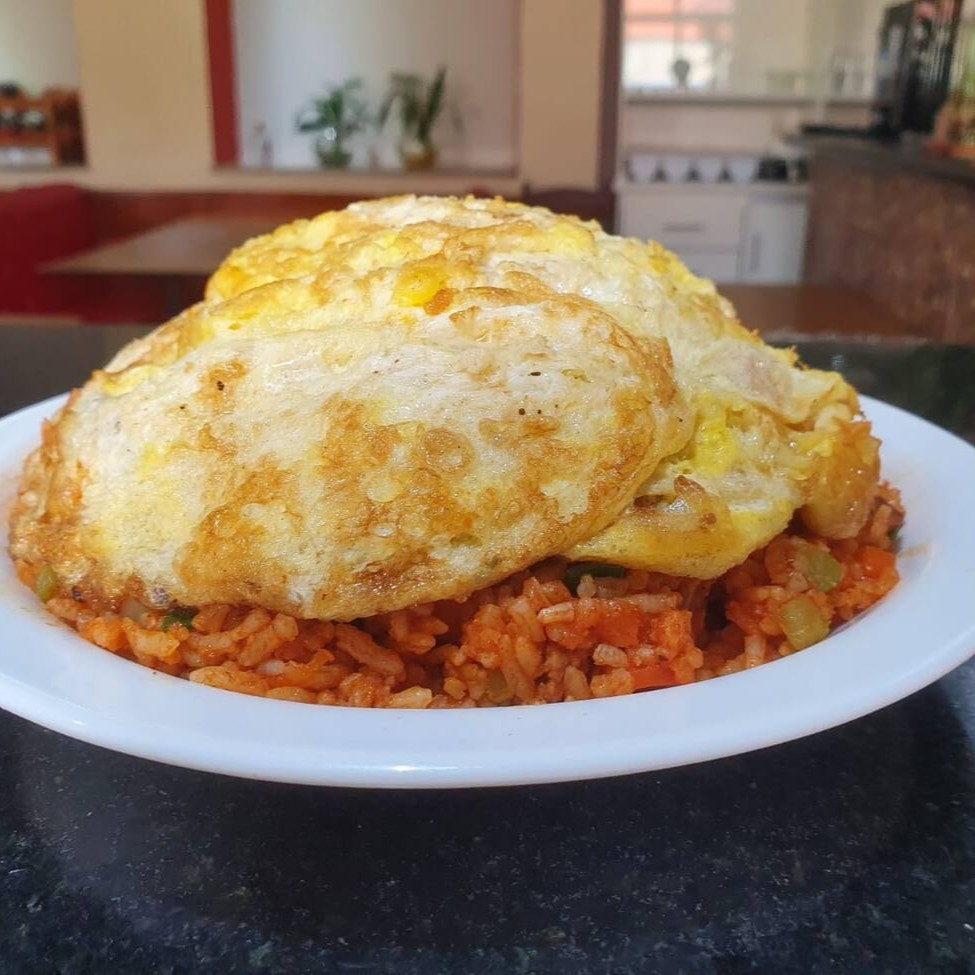 Arroz com carne bovina,massa de tomate,cenoura,vagem ,cebolinha e coberto com omelete.