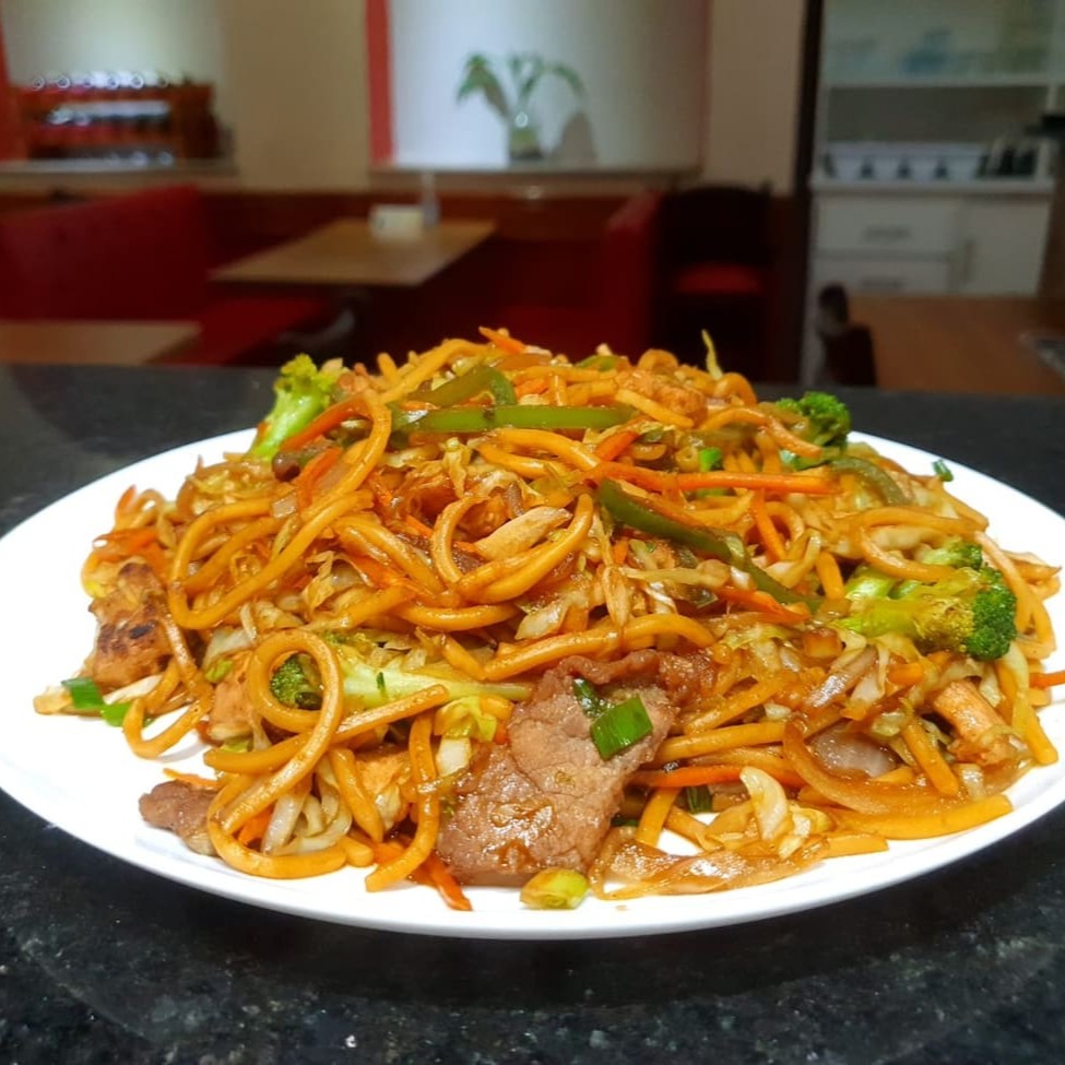 Macarrão com carne bovina e frango ao molho de shoyu.