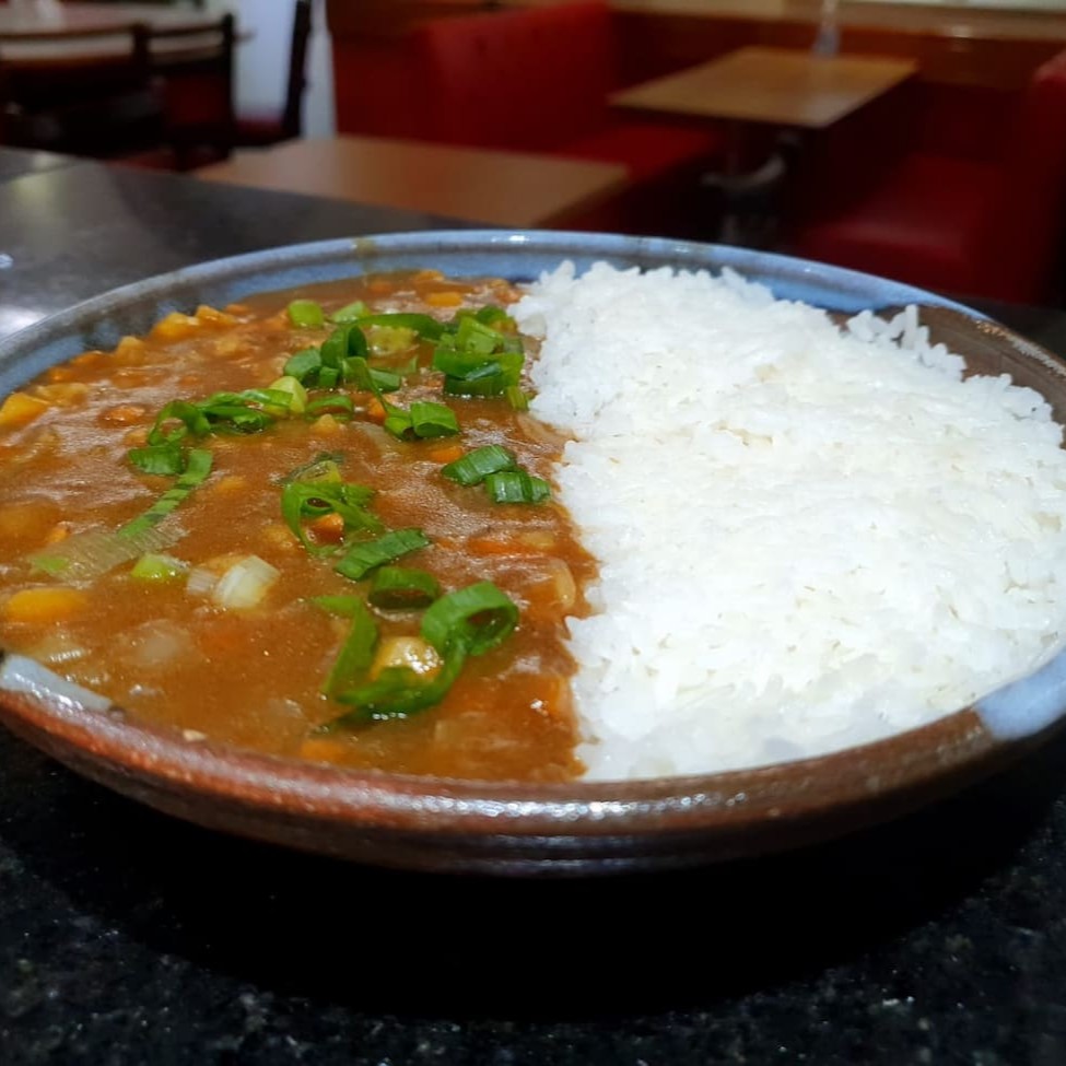 Gohan ao molho curry com batata,talo de brocolis ,cenoura, carne suino