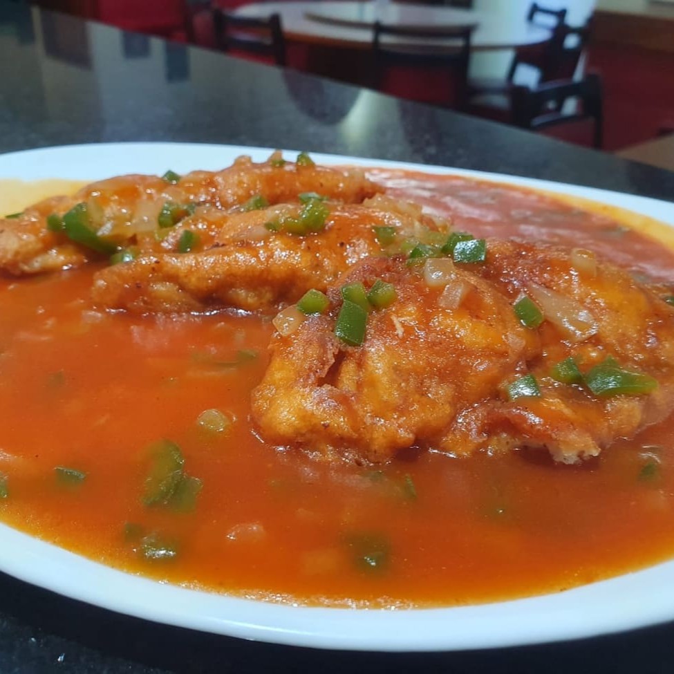 File de Peixe ao molho de tomate com cebola e pimentão picados com pimenta.