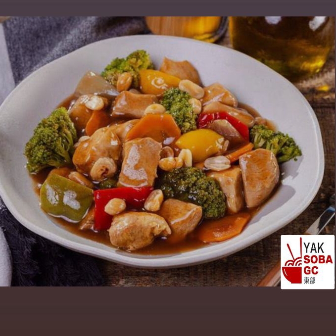 Peito de frango, pimentão, cebola, cenoura e amendoim ao molho oriental.
