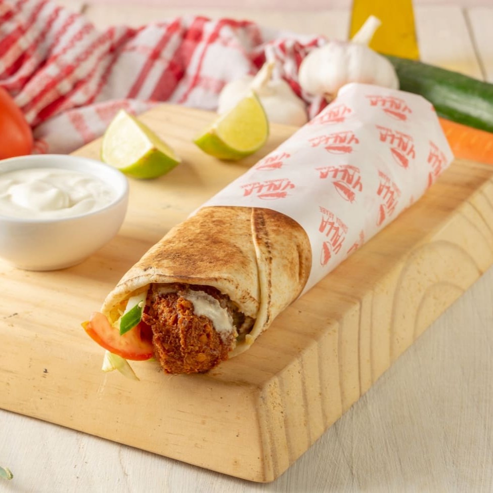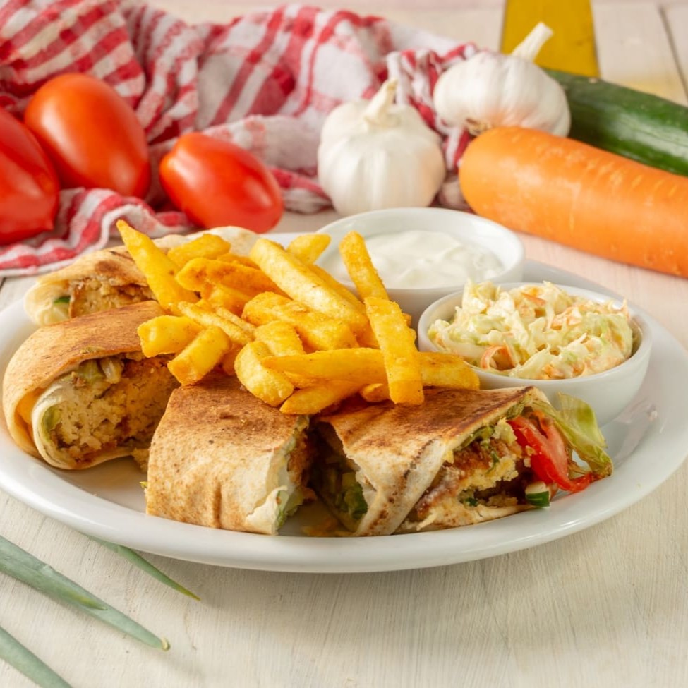 Acompanha fritas, salada yalla e creme de alho. Lanche de falafel (bolinho de grão de bico) no pão sírio, molho tarator (tahine), creme de alho, tomate, pepino, salsa, hortelã.