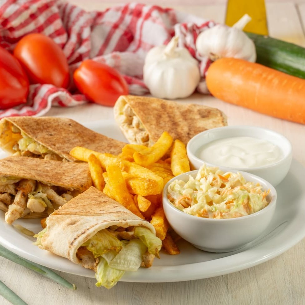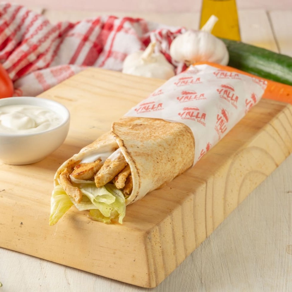 Acompanha fritas, salada yalla e creme de alho. Lanche de frango no pão sírio, creme de alho e alface.