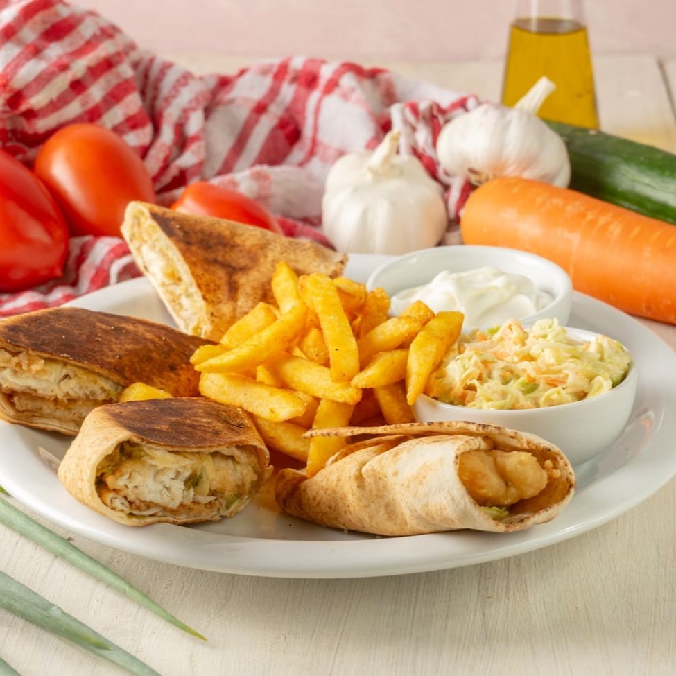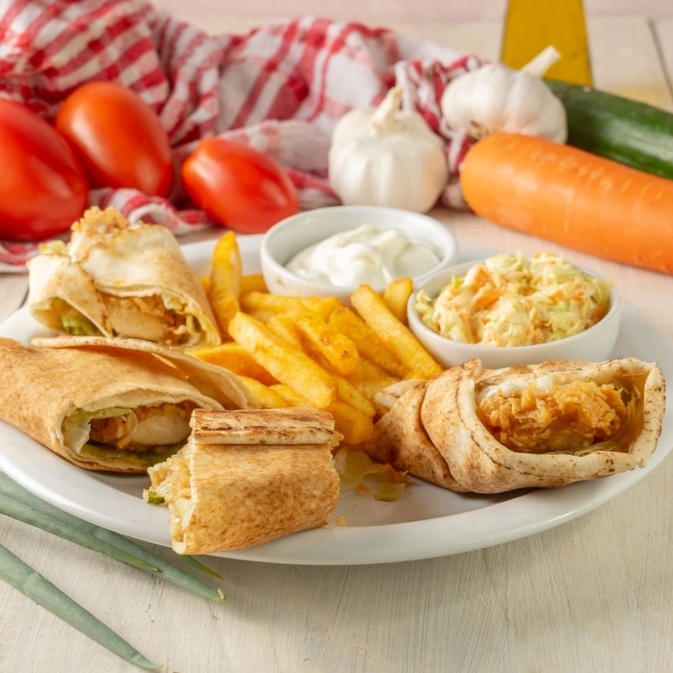 Acompanha fritas, salada yalla e creme de alho. Lanche de iscas de peixe empanado e frito no pão sírio, alface, tomate, creme de alho e molho de tahine.