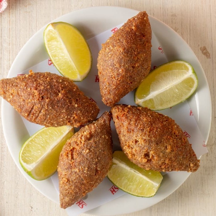 4 kibes de 80g com molho de coalhada temperada com nozes e salsa.