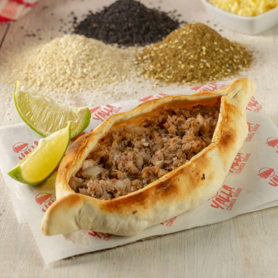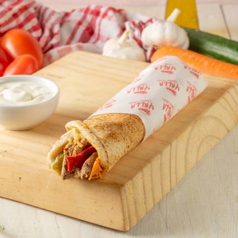 Lanche de carne no pão sírio, com regolfados de pimentões coloridos, milho, cebola, champigno, muçarela e creme de alho. O combo acompanha batata frita, creme de alho e salada yalla.