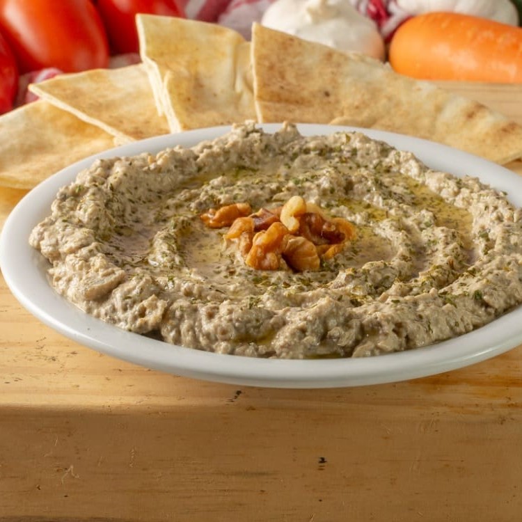 Pasta de berinjela assada com tahine. Acompanha 1 pão sírio