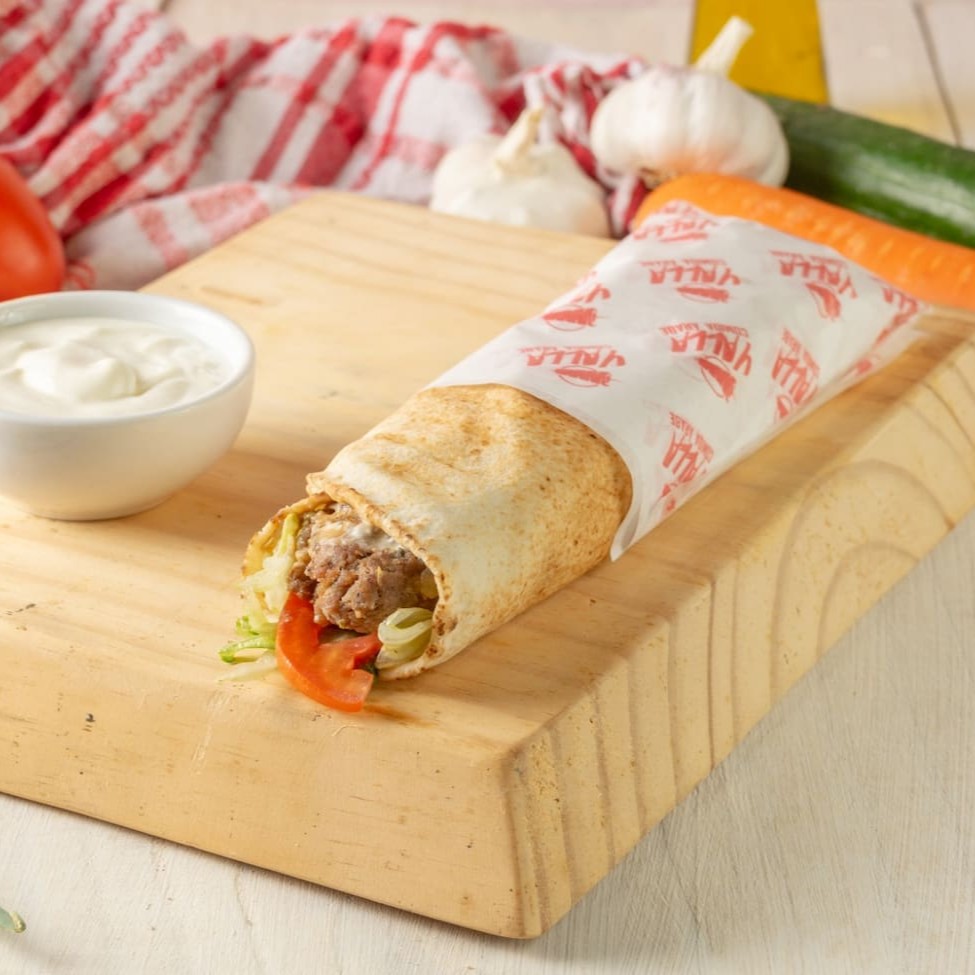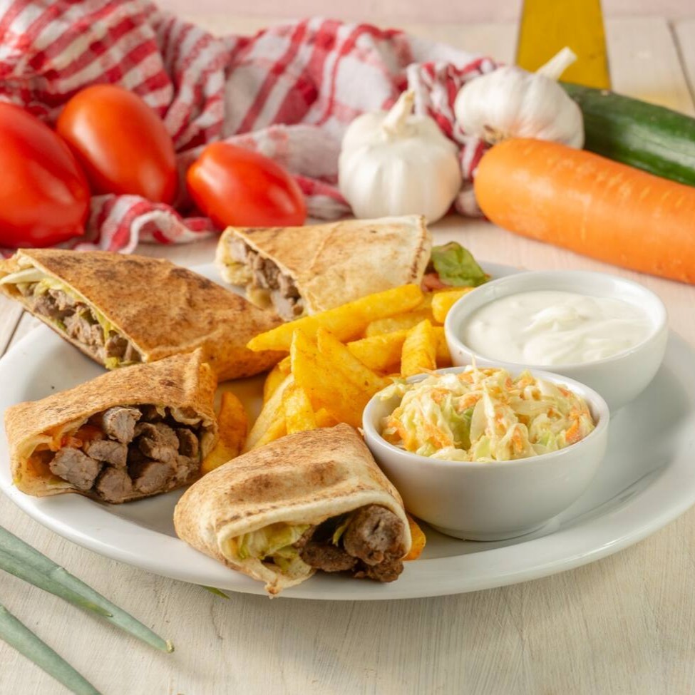 Acompanha fritas, salada yalla e creme de alho. Lanche de carne no pão sírio com molho tarator (tahine), creme de alho, alface, tomate.
