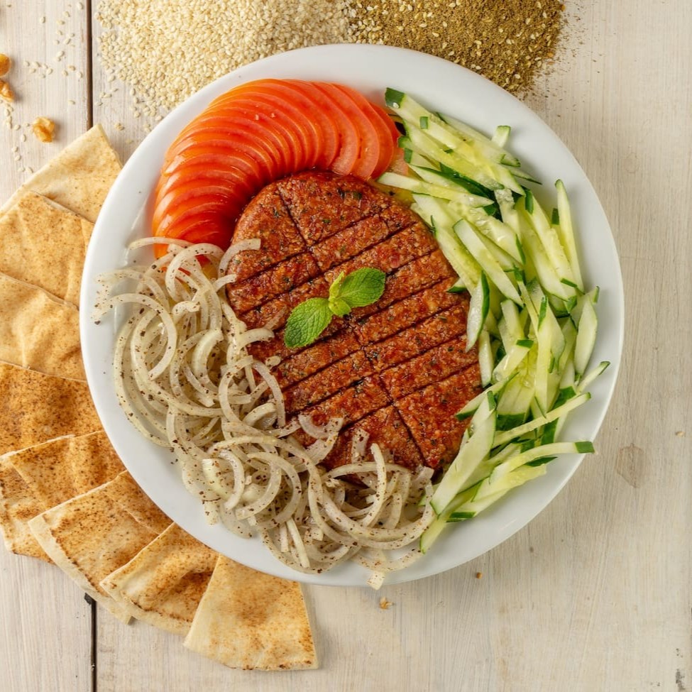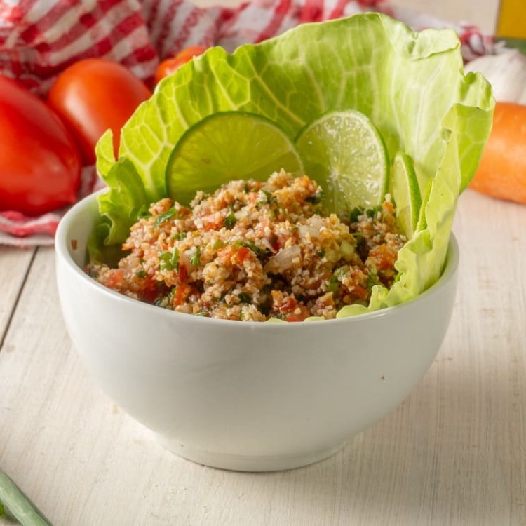 250g de carne vermelha sem gordura, trigo, hortelã e azeite. Acompanha tomate, pepino, cebola temperada e 1 pão sírio