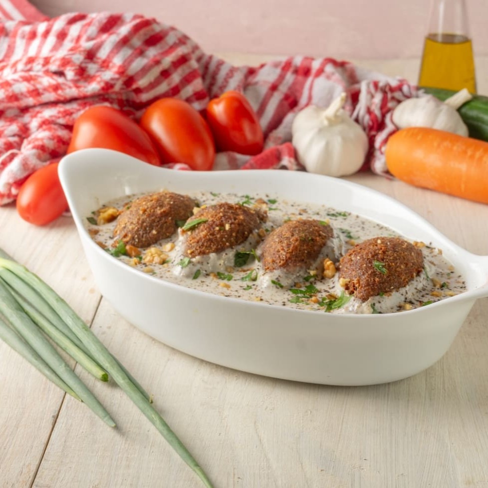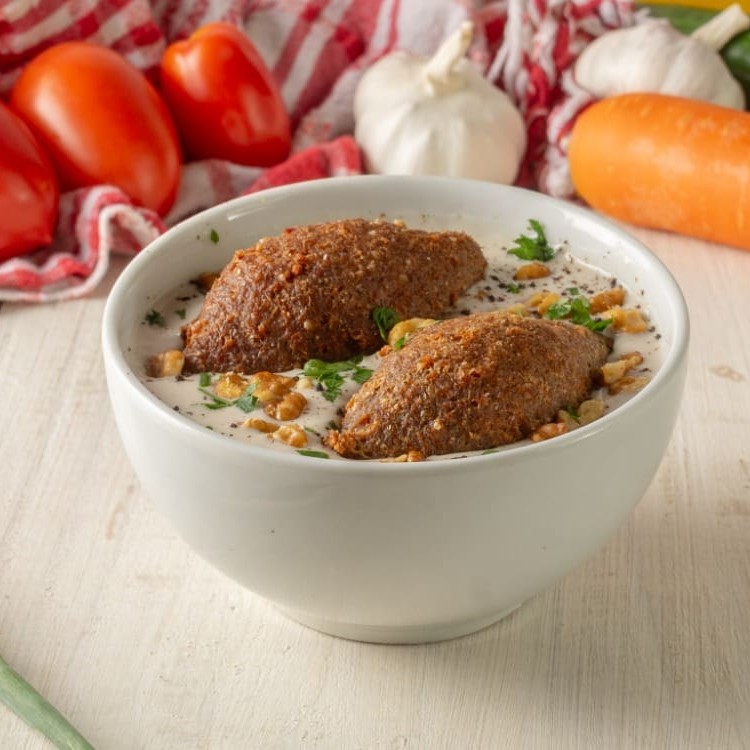 2 kibes de 80g ao molho de coalhada temperada com nozes e salsa.
