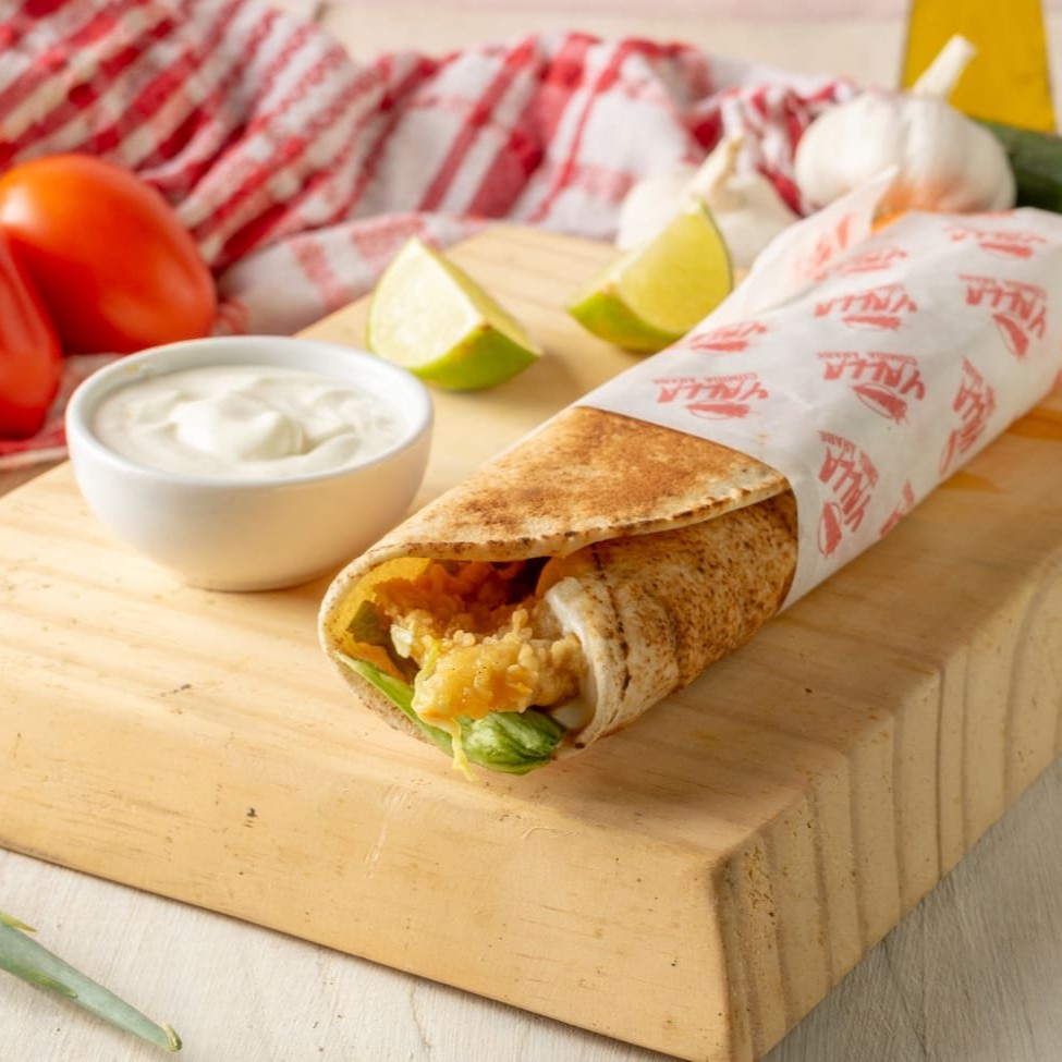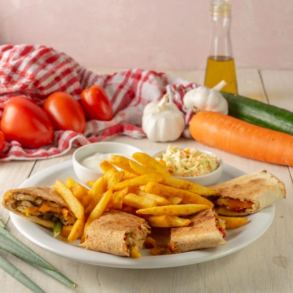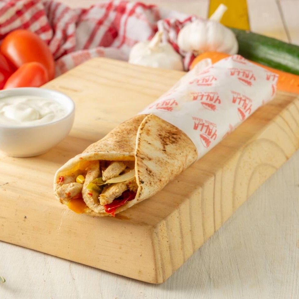 Acompanha fritas, salada yalla e creme de alho. Lanche de frango no pão sírio, refogado de pimentões coloridos, milho, cebola, cogumelo champignon, queijo mozarela e creme de alho.