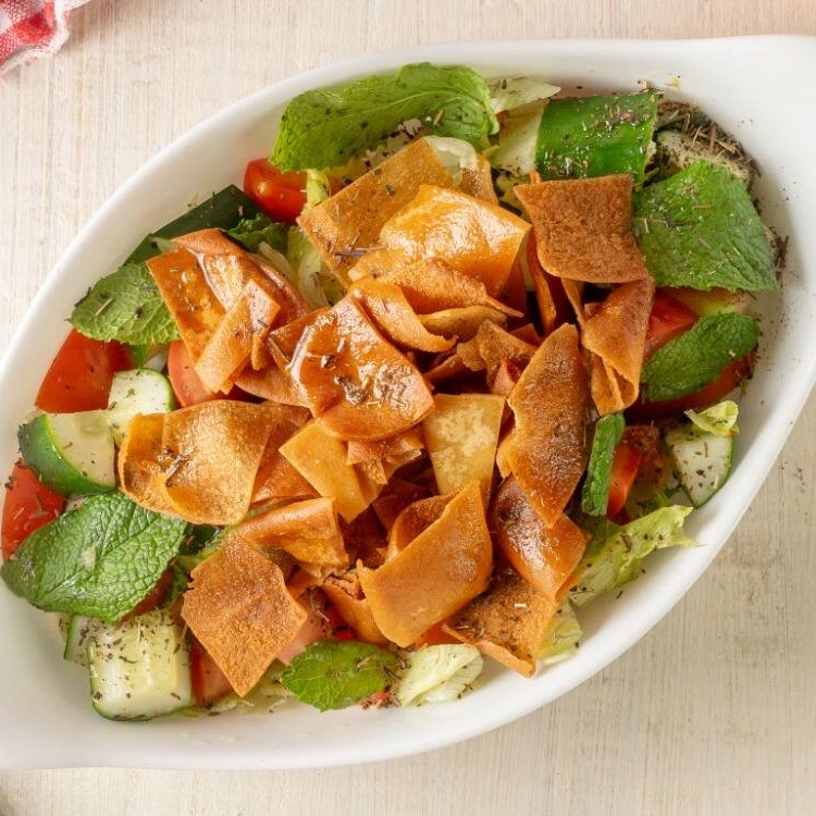 Salada de alface, tomate, pepino, cebola e hortelã. Acompanha pão sírio frito e tempero especial.