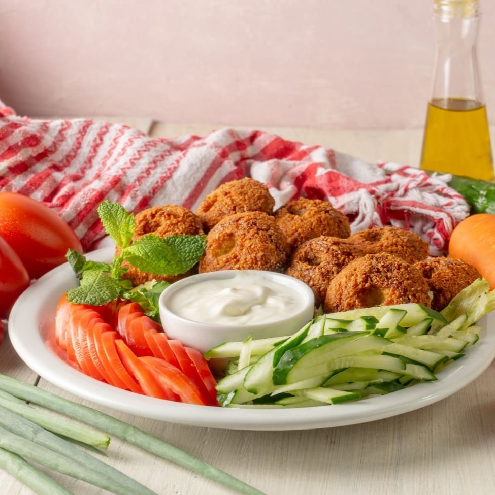 8 unidades de falafel (bolinho de grão de bico) pão sírio, salada e creme de alho