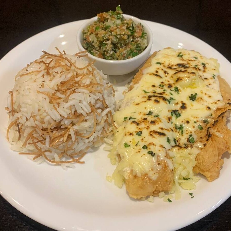 Delicioso filé de tilápia empanada ao molho de coalhada, finalizada com muçarela maçaricada. Acompanha arroz sírio e salada de tabule.