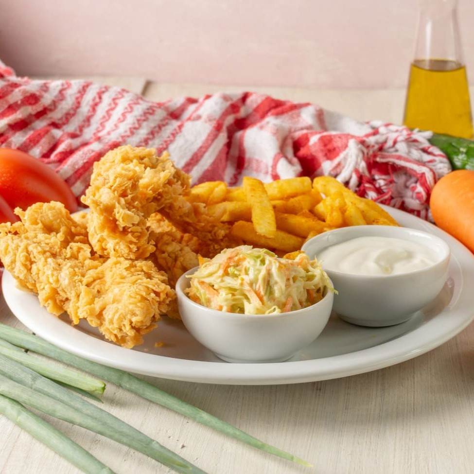4 unidades de tiras de frango empanadas e super crocantes, pão sírio, fritas, salada yalla e creme de alho
