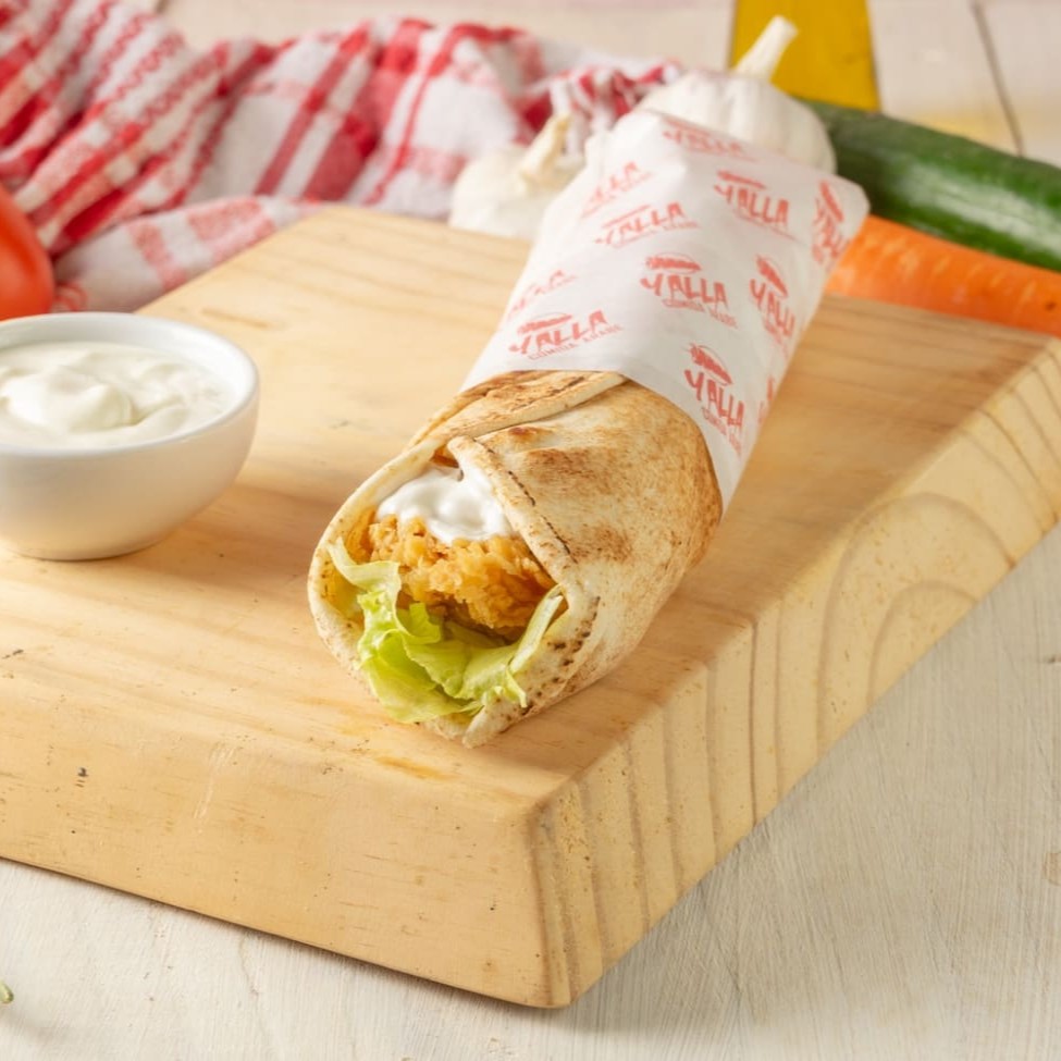 Delicioso lanche de frango frito no pão sírio, creme de alho e allface. Creme de alho a parte é enviado somente no combo.