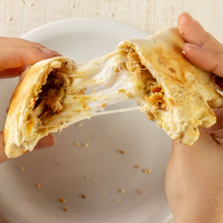 Lanche de frango no pão sírio com refogado de pimentões coloridos, milho, cebola, champignon, queijo mussarela e creme de alho. Creme de alho a parte é enviado somente no combo.